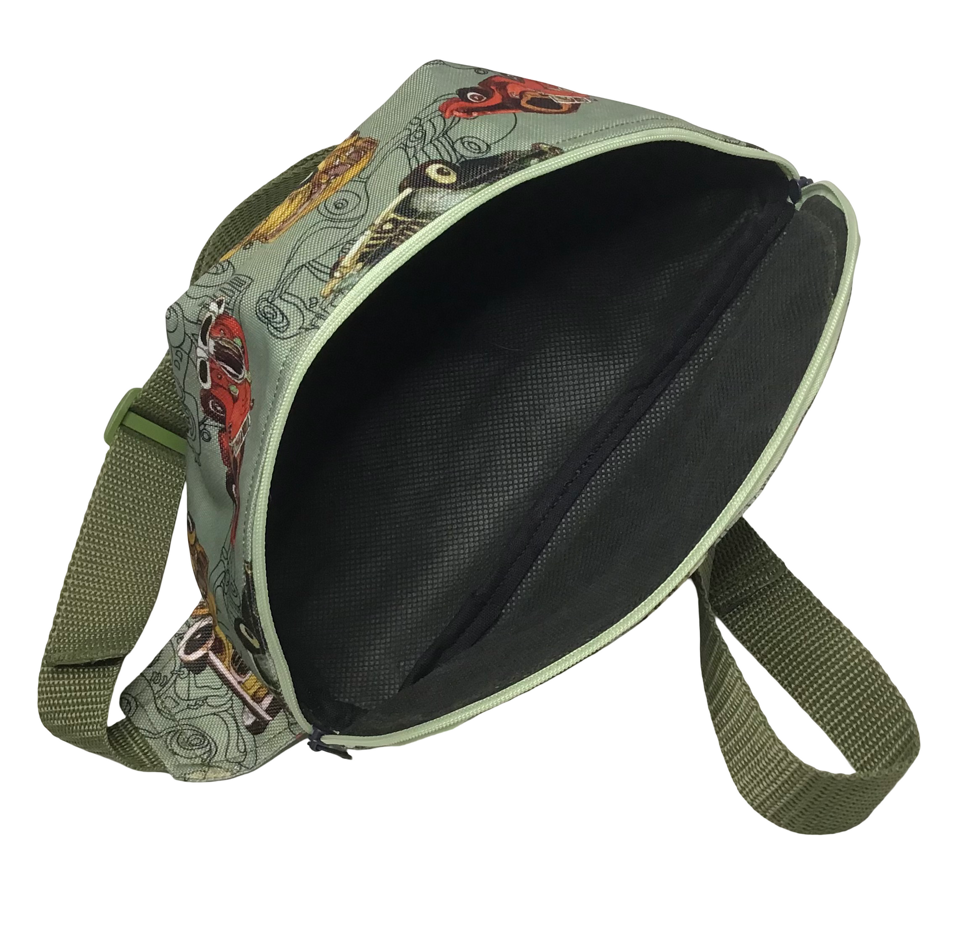 Bauchtasche aus wasserabweisendem Baumwollstoff. Der Innenstoff besteht aus schwarzem Polyestervlies. Die Tasche wird mit einem Reißverschluß und 2 Metallzippern verschlossen. Das Poyester Gurtband kann individuell verstellt werden.