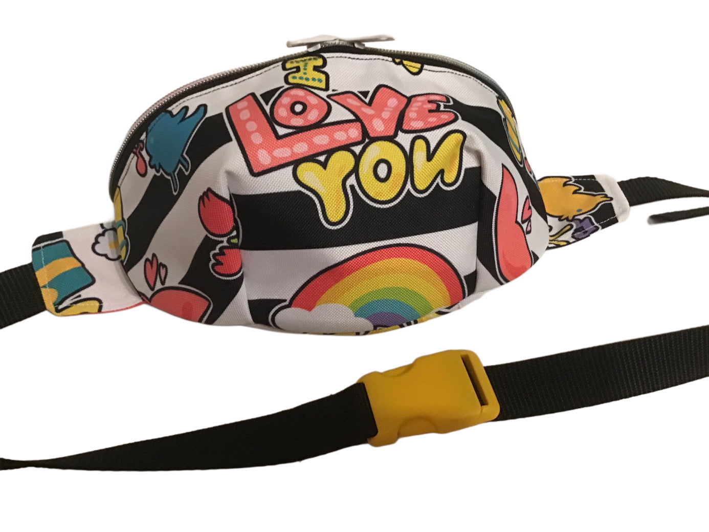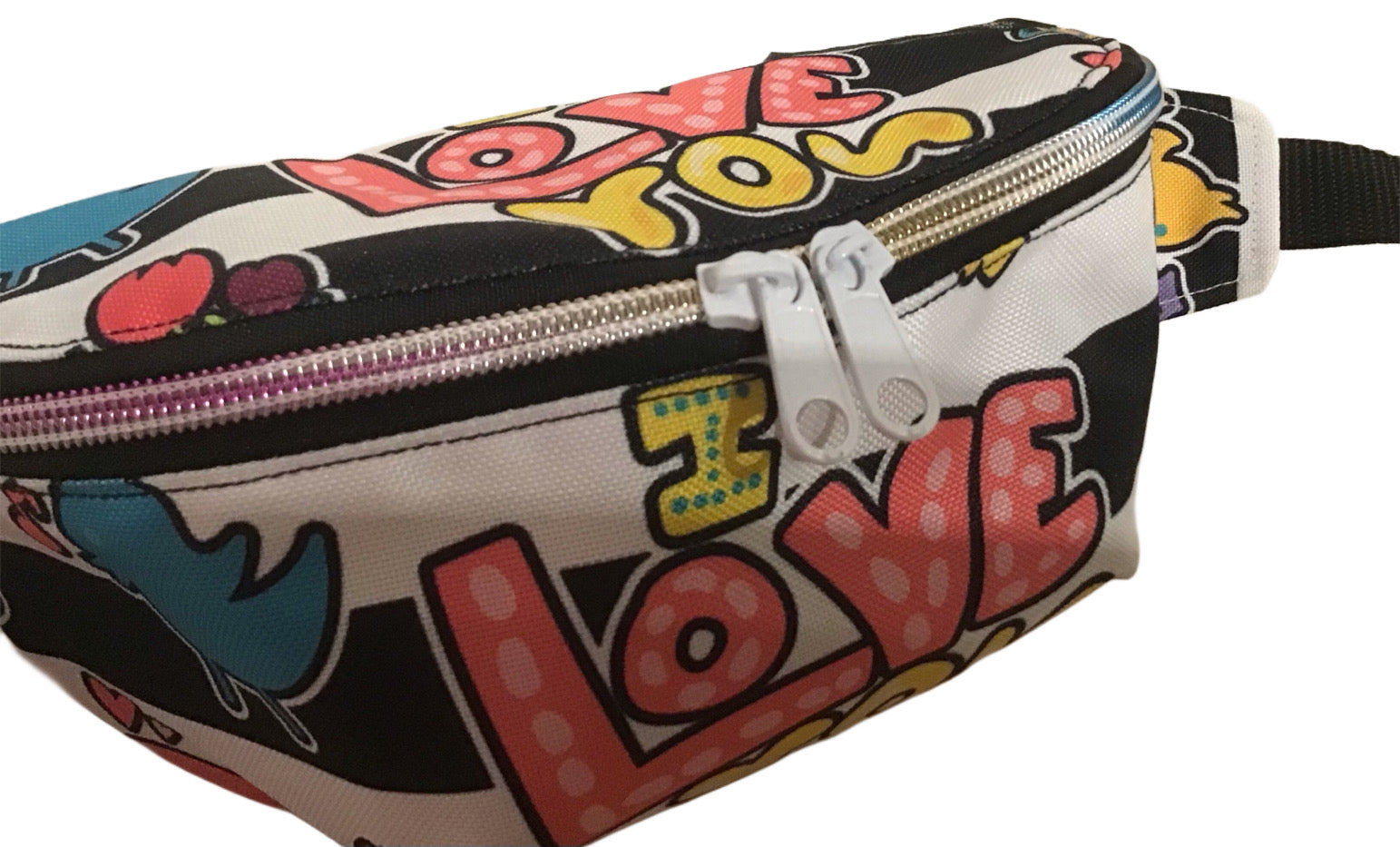 Bauchtasche aus wasserabweisendem Baumwollstoff. Der Innenstoff besteht aus schwarzem Polyestervlies. Die Tasche wird mit einem Reißverschluß und 2 Metallzippern verschlossen. Das Poyester Gurtband kann individuell verstellt werden.