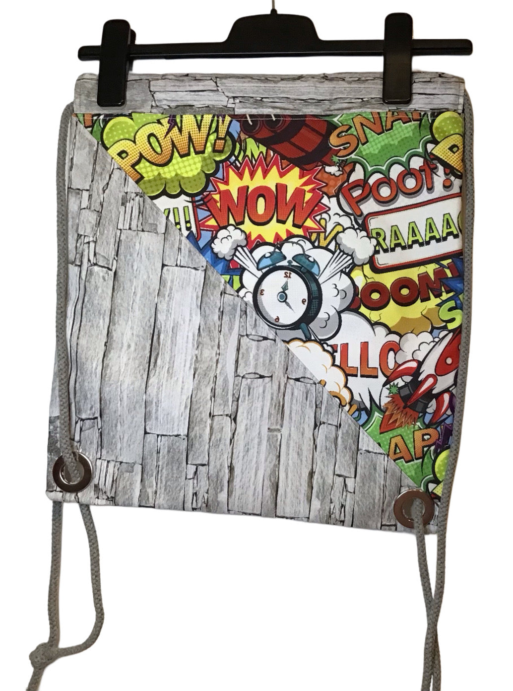 Professioneller Turnbeutel im Comic-Stil mit wasserabweisender Beschichtung. Mit den Maßen 35 cm breit und 40 cm hoch bietet er ausreichend Platz für Sportausrüstung und vieles mehr. Praktisch und stylisch zugleich - der ideale Begleiter für unterwegs!